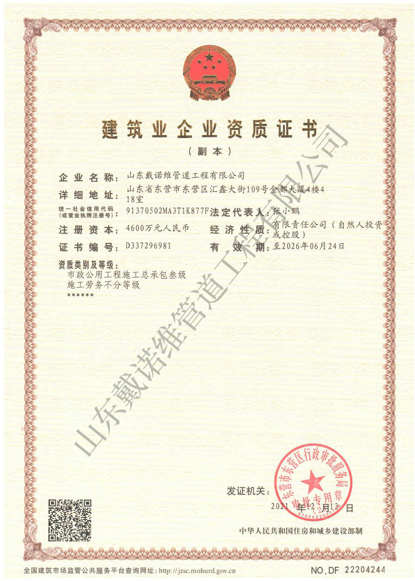 管道非開挖修復(fù)工程服務(wù)企業(yè)資質(zhì)證書